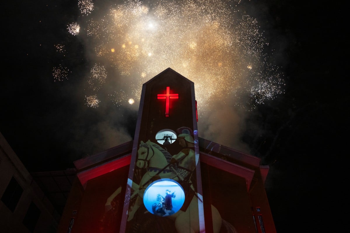 ฉลองวันนักบุญ… ดอกไม้ไฟแตกตัวเป็นแสงสีสวยงามเหนือยอดโบสถ์เซนต์จอร์จระหว่างการเฉลิมฉลองวันเซนต์จอร์จในย่านควินติโน เมืองริโอเดจาเนโร ประเทศบราซิล เมื่อวันที่ 23 เมษายน (Pablo PORCIUNCULA / AFP)