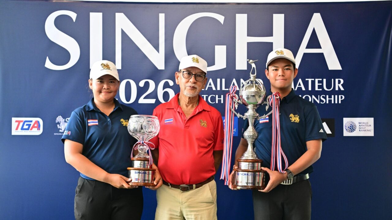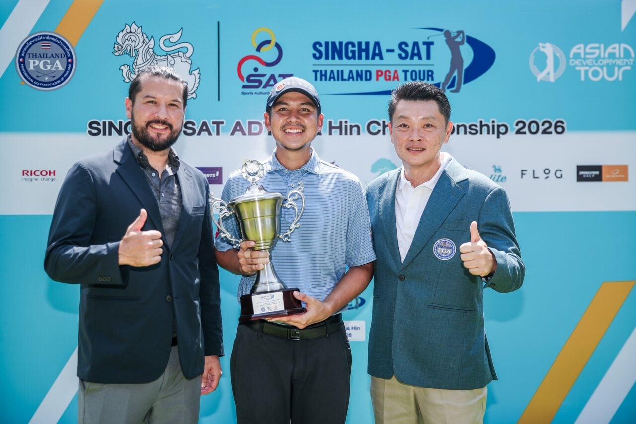 แสดงความยินดี…พงษ์รัตน์ เหลืองธำรงเจริญ นายกสมาคมกีฬากอล์ฟอาชีพฯ พร้อมด้วย เคน คุโดะ รองผู้อำนวยการฝ่ายพัฒนาทัวร์และผู้จัดการทั่วไป เอเชียน ดีเวลลอปเมนท์ ร่วมแสดงความยินดีกับ อมรินทร์ กรัยวิเชียร ที่คว้าแชมป์รายการ “สิงห์-เอสเอที เอดีที หัวหิน แชมเปียนชิพ 2026W ที่สนามรอยัล หัวหิน กอล์ฟ คอร์ส จ.ประจวบคีรีขันธ์