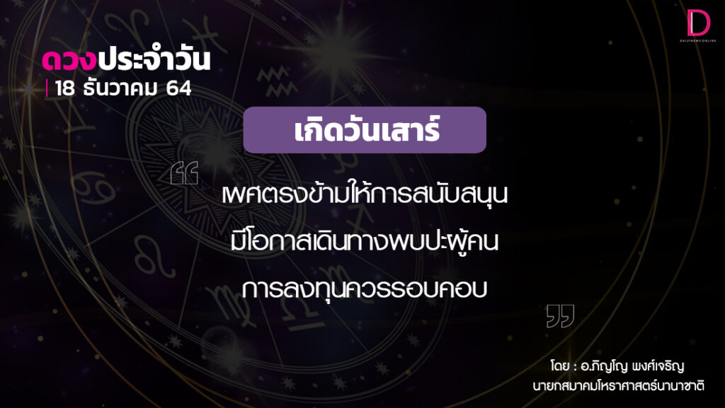 เกิดวันเสาร์ จะมีเพศตรงข้ามที่ดีเข้ามาให้การสนับสนุน ได้ทำงานที่ตรงกับความรู้ความสามารถ จะได้ทำงานพิเศษที่เกี่ยวข้องกับส่วนรวม มีการปรับปรุงเกี่ยวกับบ้านเรือนที่อยู่อาศัยให้ดีขึ้น มีโอกาสได้เดินทางและพบปะกับผู้คนมากมาย ความสัมพันธ์กับบุคคลอื่นควรสืบดูประวัติความเป็นมาให้ดี รู้เขารู้เราไว้เป็นดีที่สุด.