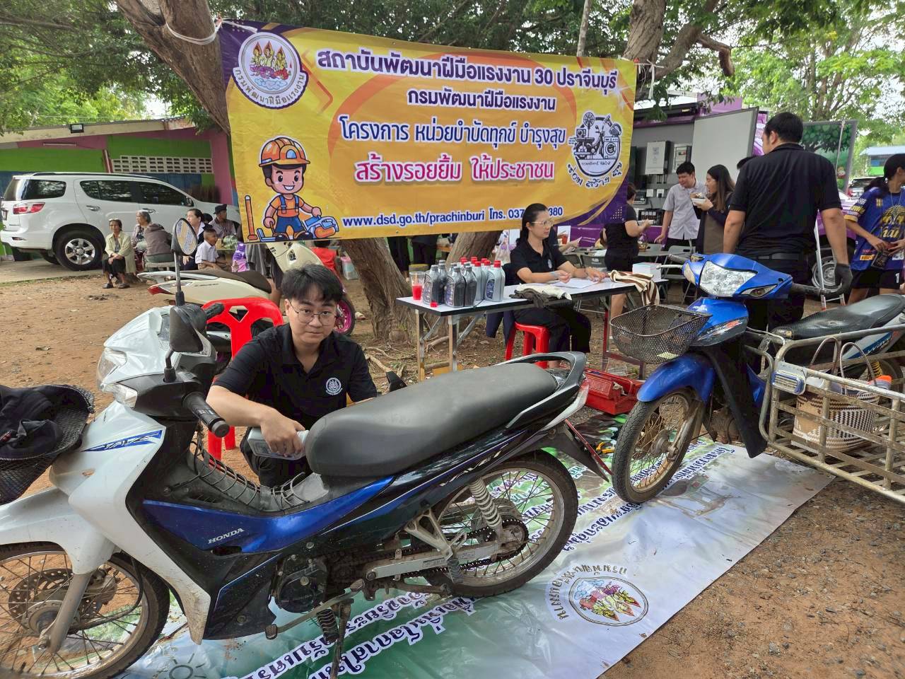 บริการประชาชน…นางสาวยุวดี เก้าเอียน ผู้อำนวยการสถาบันพัฒนาฝีมือแรงงาน 30 ปราจีนบุรี พร้อมด้วยข้าราชการสังกัดกระทรวงแรงงานและคณะเจ้าหน้าที่ ได้เข้าร่วมออกหน่วยบริการในโครงการ “หน่วยบำบัดทุกข์ บำรุงสุข” สร้างรอยยิ้มให้ประชาชน” ประจำปีงบประมาณ พ.ศ. 2569 ให้บริการเปลี่ยนถ่ายน้ำมันเครื่องรถจักรยานยนต์แก่ประชาชนในพื้นที่ พร้อมดำเนินการประชาสัมพันธ์ภารกิจของหน่วยงาน เพื่อสร้างการรับรู้แก่ประชาชน