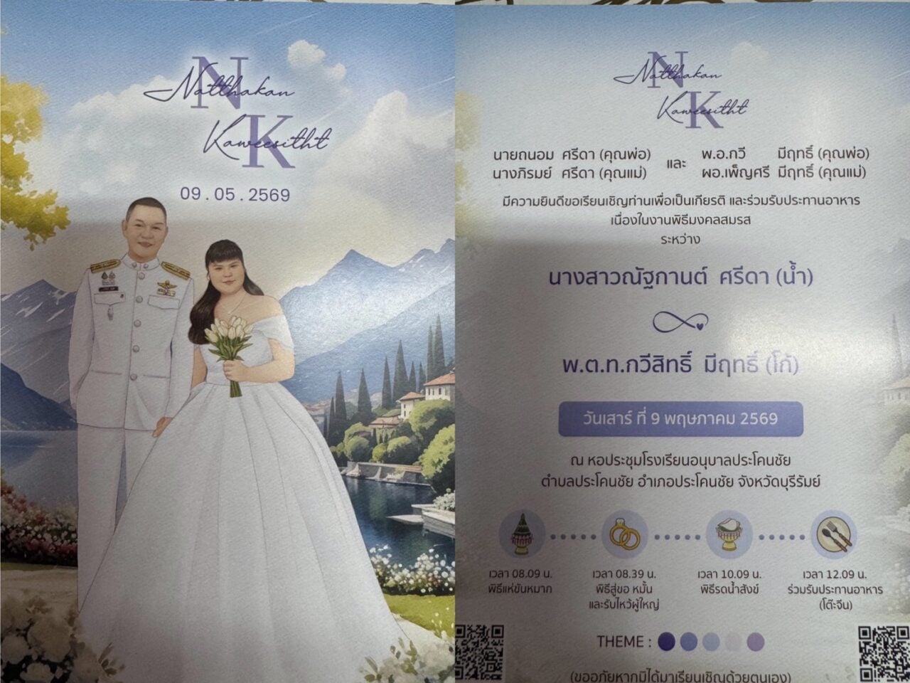 งานมงคลสมรส….ขอเชิญร่วมแสดงความยินดีและเป็นสักขีพยาน เนื่องในพิธีมงคลสมรสระหว่าง นางสาวณัฐกานต์ ศรีดา (น้ำ) และ พ.ต.ท.กวีสิทธิ์ มีฤทธิ์ (โก้) ในวันเสาร์ที่ 9 พฤษภาคม 2569 ณ หอประชุมโรงเรียนอนุบาลประโคนชัย ต.ประโคนชัย อ.ประโคนชัย จ.บุรีรัมย์ โดยมีกำหนดการพิธีการในช่วงเช้าจนถึงช่วงเที่ยง เพื่อความเป็นสิริมงคลตามประเพณีไทย ดังนี้: เวลา 08.09 น.: พิธีแห่ขันหมาก เวลา 08.39 น.: พิธีสู่ขอ หมั้น และรับไหว้ผู้ใหญ่ เวลา 10.09 น.: พิธีรดน้ำสังข์ เวลา 12.09 น.: ร่วมรับประทานอาหาร (โต๊ะจีน)