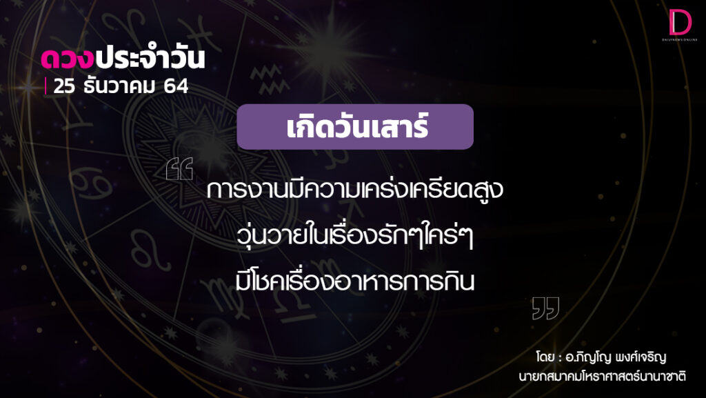 วันนี้ เวลา 00.00-24.00 น. ดาวจันทร์เสวยปุรพผลคุณีนักษัตรฤกษ์ที่ 11 ประกอบด้วย มหัทธโนแห่งฤกษ์ มหัทธโน แปลว่า เศรษฐี ผู้มั่งคั่งด้วยทรัพย์สินเงินทอง วันเสาร์-อุบาทว์ตามกาลโยค เวลา 00.00-24.00 น.-ห้ามทำการมงคล ทิศที่เป็นมงคล-เหนือ ทิศอัปมงคล-ใต้ สีประจำวัน-สีดำ สีสิริมงคล-ฟ้า น้ำเงิน สีอัปมงคล-เขียวสด ราศีที่ดาวศรีสถิต-มังกร ราศีที่ดาวกาลีสถิต-ธนู