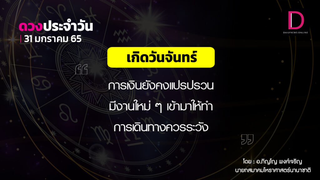 วันนี้ เวลา 00.00-21.30 น. ดาวจันทร์เสวยอุตราษาฒนักษัตรฤกษ์ที่ 21 ประกอบด้วยโจโรแห่งฤกษ์ โจโร แปลว่า โจร ผู้ปล้น ผู้ลักขโมย เวลา 21.31-24.00 น. ดาวจันทร์เสวยศรวณนักษัตรฤกษ์ที่ 22 ประกอบด้วย ภูมิปาโลแห่งฤกษ์ ภูมิปาโล แปลว่า ผู้รักษาแผ่นดิน วันจันทร์-อธิบดีตามกาลโยค เวลา 00.00-12.49 น.-ทำการมงคลได้ตามฤกษ์บนหมวดโจโรฤกษ์ เวลา 12.50-24.00 น.-ห้ามทำการมงคล ทิศที่เป็นมงคล-ตะวันตกเฉียงใต้ ทิศอัปมงคล-ตะวันออกเฉียงเหนือ สีประจำวัน-ขาว สีสิริมงคล-ดำม่วงแก่ เทา สีอัปมงคล- แดง แดงส้ม ราศีที่ดาวศรีสถิต-มังกร ราศีที่ดาวกาลีสถิต-มังกร