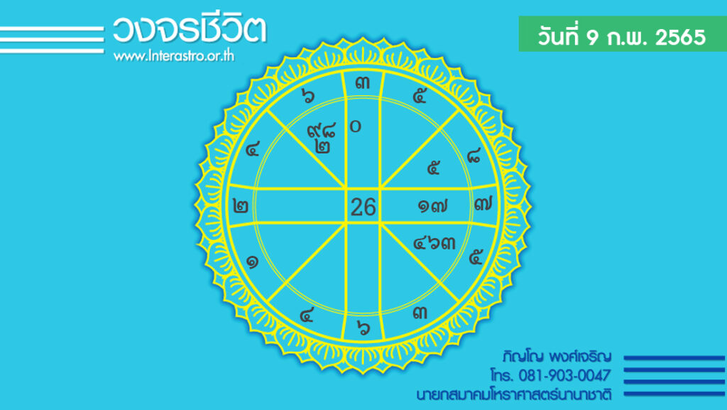 สุริยคติกาล วันที่ 9 กุมภาพันธ์ พ.ศ. 2565 ค.ศ. 2022 จันทรคติกาล ตรงกับวันพุธ ขึ้น 8 ค่ำ เดือน 3 ปีฉลู ตรีศก จุลศักราช 1383 อาทิตย์อุทัย เวลา 06.43 น. เที่ยงจริง เวลา 12.33 น. อาทิตย์ตก เวลา 18.21 น. จันทร์ตก เวลา 01.01 น.