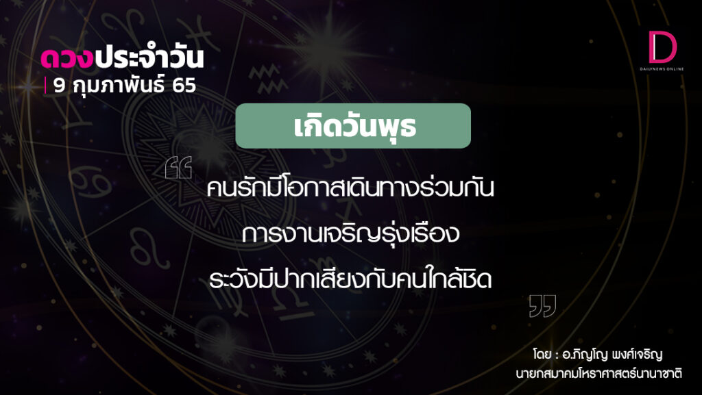 วันนี้ เวลา 00.00-24.00 น. ดาวจันทร์เสวยกฤตติกานักษัตรฤกษ์ที่ 3 ประกอบด้วยโจโรแห่งฤกษ์ โจโร แปลว่า โจร ผู้ปล้น ผู้ลักขโมย การใช้กำลังหรือใช้อำนาจเข้าทำการบังคับ ช่วงชิงกรรมสิทธิ์ของคนอื่นโดยพลการ วันพุธ-โลกา วินาศตามกาลโยค เวลา 00.00-24.00 น.-ห้ามทำการมงคล ทิศที่เป็นมงคล-ตะวันตกเฉียงเหนือ ทิศอัปมงคล-ตะวันออกเฉียงใต้ สีประจำวัน-เขียว สีสิริมงคล-ม่วงดอกตะแบก สีอัปมงคล-ชมพู ราศีที่ดาวศรีสถิต-พฤษภ ราศีที่ดาวกาลีสถิต-ธนู