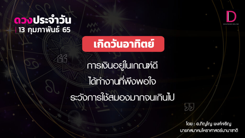 วันนี้ เวลา 00.00-08.18 น. ดาวจันทร์เสวยอารทรานักษัตรฤกษ์ที่ 6 ประกอบด้วยเทวีแห่งฤกษ์ เทวี แปลว่า นางพญา เวลา 08.19-24.00 น. ดาวจันทร์เสวยปุนนัพสุนักษัตรฤกษ์ที่ 7 ประกอบด้วยเพชฌฆาตแห่งฤกษ์ เพชฌฆาต แปลว่า ผู้ฆ่า ทำการเพื่อให้สิ่งที่เข้ามาพ่ายแพ้ วันอาทิตย์-ธงไชยตามกาลโยค เวลา 00.00-24.00 น.-ห้ามทำการมงคล ทิศที่เป็นมงคล-ใต้ ทิศอัปมงคล-เหนือ สีประจำวัน-แดง สีสิริมงคล-เขียวสด สีอัปมงคล-ฟ้า น้ำเงิน ราศีที่ดาวศรีสถิต-มังกร ราศีที่ดาวกาลีสถิต-ราศีธนู