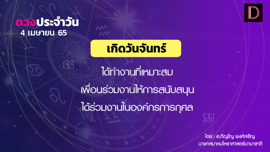 เกิดวันจันทร์ จะได้ทำงานที่เหมาะสมกับวุฒิภาวะและความถนัด มีโอกาสได้ศึกษาวิชาการที่แปลก ๆ จะได้ร่วมงานในองค์กรการกุศล ผู้ใหญ่และเพื่อนร่วมงานจะให้การสนับสนุนเป็นอย่างดี การเจรจาติดต่อประสานงานจะประสบความสำเร็จ จะมีผลงานเป็นที่ปรากฏ ทำให้ได้ตำแหน่งที่ดีและมีความเจริญก้าวหน้า จะได้ร่วมงานในองค์กรการกุศล
