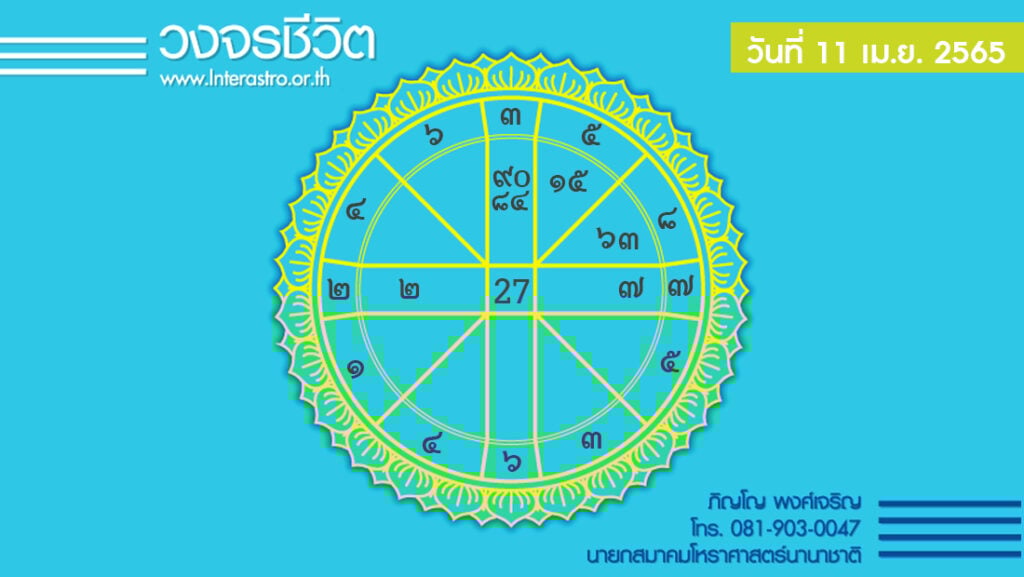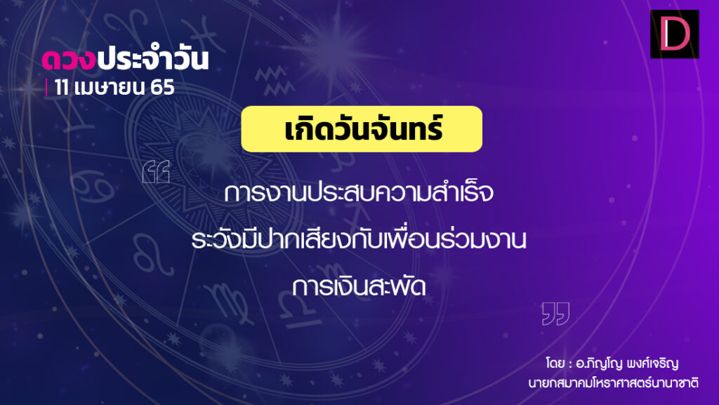 วันนี้ เวลา 00.00-03.54 น. ดาวจันทร์เสวยปุษยะนักษัตรฤกษ์ที่ 8 ประกอบด้วยราชาแห่งฤกษ์ ราชา แปลว่า พระเจ้าแผ่นดิน เวลา 03.55-24.00 น. ดาวจันทร์เสวยอาศเลษานักษัตรฤกษ์ที่ 9 ประกอบด้วยสมโณแห่งฤกษ์ สมโณ แปลว่า ผู้สงบ หมายถึง นักบวช พระสงฆ์ สมณชีพราหมณ์ นักสอนศาสนา ครูบาอาจารย์ ผู้ถือสันโดษ วันจันทร์-อธิบดีตามกาลโยค เวลา 00.00-24.00 น.-ห้ามทำการมงคล ทิศที่เป็นมงคล-ตะวันตกเฉียงใต้ ทิศอัปมงคล-ตะวันออกเฉียงเหนือ สีประจำวัน-ขาว สีสิริมงคล-ดำ ม่วงแก่ เทา สีอัปมงคล-แดง แดงส้ม ราศีที่ดาวศรีสถิต-มังกร ราศีที่ดาวกาลีสถิต-มีน