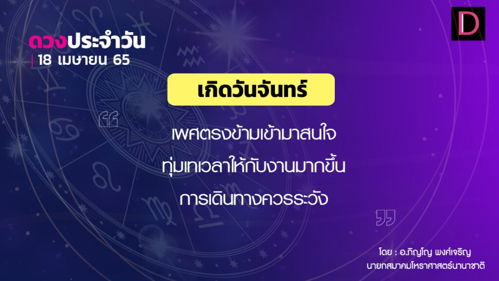 วันนี้ เวลา 00.00-05.54 น. ดาวจันทร์เสวยสวาตินักษัตรฤกษ์ที่ 15 ประกอบด้วยเทวีแห่งฤกษ์ เทวี แปลว่า นางพญา หมายถึง สตรีผู้มีฐานะและตำแหน่งสูง เวลา 05.55-24.00 น. ดาวจันทร์เสวยวิสาขานักษัตรฤกษ์ที่ 16 ประกอบด้วยเพชฌ ฆาตแห่งฤกษ์ เพชฌฆาต แปลว่า ผู้ฆ่า ทำการเพื่อให้สิ่งที่เข้ามาพ่ายแพ้ ข่มขวัญ น่ายำเกรง มีความขลังและศักดิ์สิทธิ์ เวลา 00.00-20.38 น.-ห้ามทำการมงคล เวลา 20.39-24.00 น.-ทำการมงคลได้ตามฤกษ์บนหมวดเพชฌฆาตฤกษ์ ทิศที่เป็นมงคล-ตะวันตกเฉียงใต้ ทิศอัปมงคล-ตะวันออกเฉียงเหนือ สีประจำวัน-ขาว สีสิริมงคล-ดำ ม่วงแก่ เทา สีอัปมงคล-แดง แดงส้ม ราศีที่ดาวศรีสถิต-มังกร ราศีที่ดาวกาลีสถิต-เมษ