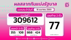การแสดงผลสลากกินแบ่งรัฐบาลนี้ ไม่สามารถนำไปอ้างอิงการขึ้นเงินรางวัลได้ กรุณาตรวจสอบความถูกต้องอีกครั้ง ที่เว็บไซต์กองสลากกินแบ่งรัฐบาล