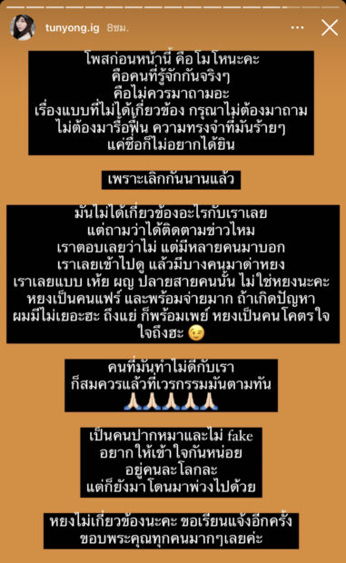ล่าสุด สาวตันหยง ก็ได้ออกมาชี้แจ้งถึงเรื่องราวดังกล่าวผ่านทางสตอรี่ไอจี โดยระบุว่า “กฎแห่งกรรม ยุติธรรมเสมอ เลิกกันปีกว่าแล้วค่ะ พักโยงนะแม่ อิฉันไม่เกี่ยว”