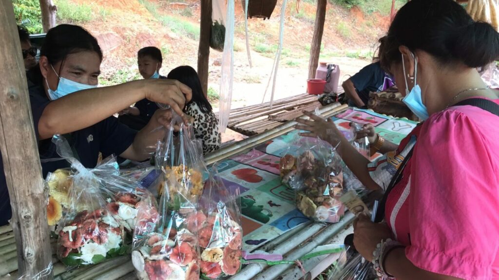 ช่วงนี้เห็ดป่าจะมีรสชาติมีความสมบูรณ์เต็มที่ และเต็มไปด้วยธาตุอาหาร มีความอร่อย แถมดอกสวย ส่งผลให้ตนเอง และครอบครัวพากันออกไปหาเก็บเห็ดป่า โดยใช้ไฟฉายส่องตั้งแต่เช้ามืด พอช่วงสาย ๆ ก็กลับเข้าบ้าน เพื่อเตรียมนำเห็ดออกมาวางจำหน่าย บริเวณลานจำหน่ายสินค้าของชุมชน ริมถนนสายชัยภูมิ-นครสวรรค์ ทำให้มีรายได้เข้าครอบครัวในช่วงนี้เฉลี่ยถึงวันละไม่น้อยกว่า 500-1,000 บาทเลยทีเดียว ซึ่งการออกหาเก็บเห็ดป่า จะได้แต่ละวันไม่น้อยกว่า 5-10 กิโลกรัม โดยจะใส่ถุงขายในราคาถุงละ 50–200 บาท ถ้าเป็นกิโลกรัม ก็กิโลฯ ละ 250-400 บาท โดยเฉพาะ เห็ดตะไค และเห็ดระโงก จะขายอยู่ที่ราคากิโลกรัมล่ะ 350-400 บาท ซึ่งก็แล้วแต่ชนิดของเห็ด และขนาดของดอก ขณะที่ในบางส่วนก็จะขายส่งให้แม่ค้าในตลาดสด ที่มารับในราคากิโลกรัมละ 150–300 บาทขึ้นไป ซึ่งก็ขึ้นอยู่กับความสวยของดอกเห็ดแต่ละชนิดที่ออกในระยะนี้