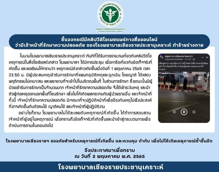 เมื่อวันที่ 3 พ.ค. จากเหตุการณ์ดังกล่าว ทาง รพ.เชียงรายประชานุเคราะห์ ซึ่งเป็นหน่วยงานต้นสังกัดของพนักงานรักษาความปลอดภัยได้มีแถลงการณ์ในเพจของโรงพยาบาล เป็นหนังสือชี้แจงอย่างเป็นทางการออกมา มีข้อความว่า “ในนามโรงพยาบาลเชียงรายประชานุเคราะห์ ทันทีที่ได้รับการรายงานเที่ยวกับคลิปวีดิโอเหตุการณ์ในสื่อโซเซียลดังกล่าว โรงพยาบาลฯได้มีการประชุม เพื่อหารือเกี่ยวกับข้อเท็จจริงที่เกิดขึ้น และขอเรียนให้ทราบว่า เหตุการณ์ดังกล่าวเกิดขึ้นเมื่อวันที่ 1 พ.ค. 65 เวลา 23.50 น. มีผู้ประสบเหตุเข้ารับการรักษาที่แผนกอุบัติเหตุและฉุกเฉิน โดยญาติ ได้แสดงพฤติกรรมไม่เหมาะสม และพยายามที่จะเข้าไปในบริเวณพื้นที่ในส่วนการรักษา