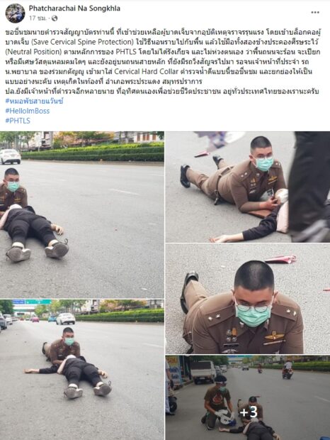 เรียกได้ว่าเป็นอีกหนึ่งเรื่องราวดีๆ ที่ชาวเน็ตบนโลกออนไลน์เข้ามาชื่นชม และต่างพากันแชร์ออกไปเป็นจำนวนมาก ภายหลังสมาชิกผู้ใช้เฟซบุ๊กรายหนึ่งที่ใช้ชื่อว่า Phatcharachai Na Songkhla ได้เผยเรื่องที่น่าชื่นชม ซึ่งเป็นภาพเจ้าหน้าที่ตำรวจนอนประคองศีรษะผู้ได้รับบาดเจ็บ โดยระบุข้อความด้วยว่า “ขอชื่นชมนายตำรวจสัญญาบัตรท่านนี้ ที่เข้าช่วยเหลือผู้บาดเจ็บจากอุบัติเหตุจราจรรุนแรง