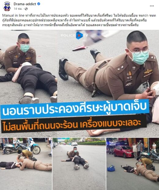 ขณะที่ด้านแฟนเพจ Drama-addict ได้แชร์เรื่องราวดังกล่าง พร้อมระบุข้อความว่า “Manual in line ท่าที่เราจะใช้ในการประคองหัว ของคนที่ได้รับบาดเจ็บที่ศีรษะ ไม่ให้ขยับเขยื้อน จนกว่าเจ้าหน้าที่กู้ภัยที่มีปลอกคอและอุปกรณ์ช่วยเหลือจะมาถึง ถ้าไม่ทำแบบนี้ แล้วขยับตัวคนที่ได้รับบาดเจ็บที่คอหรือกระดูกสันหลัง อาจทำให้อาการหนักขึ้นจนถึงขั้นอัมพาตได้ ขอแสดงความชื่นชมตำรวจท่านนี้ครับ”..