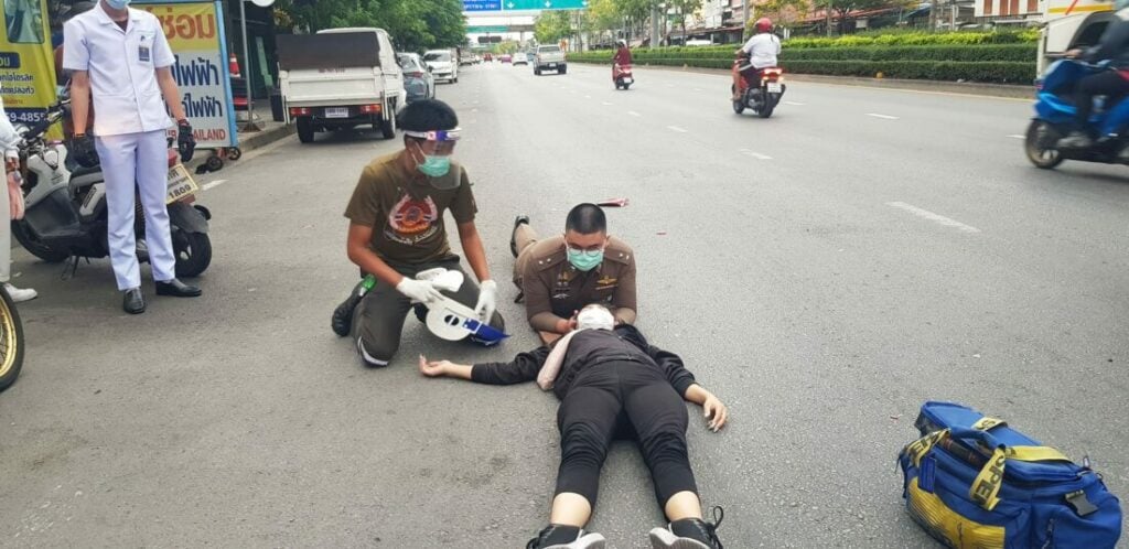 โดยเข้าบล็อกคอผู้บาดเจ็บ (Save Cervical Spine Protection) ใช้วิธีนอนราบไปกับพื้น แล้วใช้มือทั้งสองข้างประคองศีรษะไว้ (Neutral Position) ตามหลักการของ PHTLS โดยไม่ได้รังเกียจ และไม่ห่วงตนเอง ว่าพื้นถนนจะร้อน จะเปียก หรือมีเศษวัสดุแหลมคมใดๆ และยังอยู่บนถนนสายหลัก ที่ยังมีรถวิ่งสัญจรไปมา รอจนเจ้าหน้าที่ประจำ รถ น.พยาบาล ของร่วมกตัญญู เข้ามาใส่ Cervical Hard Collar