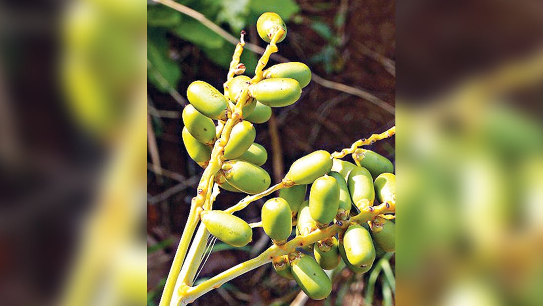เป็นปาล์มต้นเดี่ยว บางต้นอาจแตกหน่อ ลำต้นสั้นอยู่ติดดิน เส้นผ่าศูนย์กลาง 10-15 เซนติเมตร ใบรูปขนนก ช่อดอกแยกเพศอยู่ข้างต้นยาว 30 เซนติเมตร สีขาวนวล ผลรูปทรงกระบอกยาว 2 เซนติเมตร เมื่อสุกสีเหลืองส้ม ผลแก้ไอ ปลูกเป็นไม้กระถางหรือปลูกกลางแจ้ง ทนแล้งได้ดี.