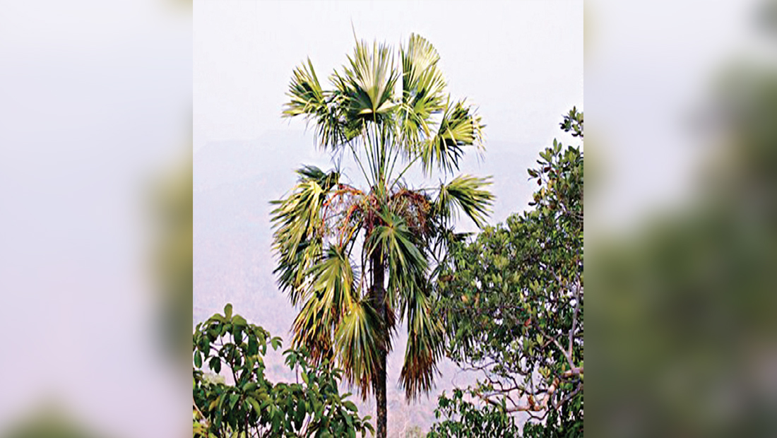 ไม้ต้น สูงได้ถึง 15 ม. ใบรูปพัด ขนาดใหญ่ เป็นกระจุกบริเวณยอด ดอกออกเป็นช่อที่ซอกใบ สีขาวอมเขียว ผลอ่อนสีเขียว ผลแก่สีเขียวอมฟ้า ออกดอกช่วงเดือนกรกฎาคม-สิงหาคม ติดผลช่วงเดือนตุลาคม-พฤศจิกายน