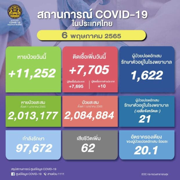 สถานการณ์แพร่ระบาดของโรคโควิด-19 ประจำวัน ศูนย์บริหารสถานการณ์การแพร่ระบาดของโรคติดเชื้อไวรัสโคโรนา 2019 (ศบค.) รายงานสถานการณ์การระบาดของไวรัสโคโรนา 2019 ล่าสุด วันที่ 6 พ.ค. 65 พบผู้ติดเชื้อโควิด-19 รายใหม่อีก 7,705 ราย จำแนกเป็นผู้ป่วยจากในประเทศ 7,695 ราย ผู้ป่วยมาจากต่างประเทศ 10 ราย ผู้ป่วยสะสม (ตั้งแต่ 1 มกราคม 2565) 2,084,884 ราย หายป่วยกลับบ้าน 11,252 ราย หายป่วยสะสม (ตั้งแต่ 1 มกราคม 2565) 2,013,177 ราย กำลังรักษา 97,672 ราย