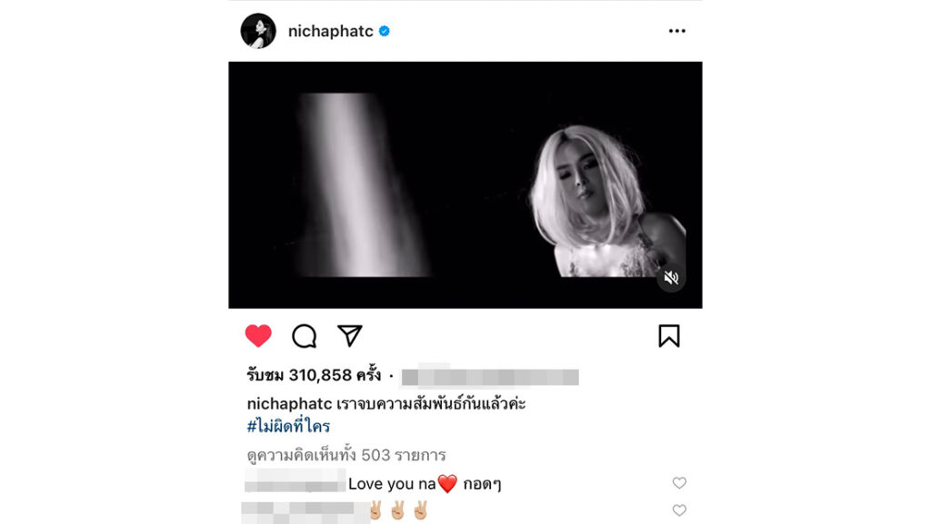 “หนูรู้สึกว่าเป็นครั้งที่ยากที่สุดตั้งแต่หนูมีความสัมพันธ์มา คือมันยากตรงที่ว่าหนูรู้สึกว่าการจะจบความสัมพันธ์กับใครสักคนโดยที่เรายังรู้สึกรักเขามากๆ มันยากมากเหมือนกัน มันก็เลยเป็นเหตุผลว่าทำไมหนูเพิ่งจะบอกให้ทุกคนทราบว่าหนูจบความสัมพันธ์กับเขาแล้ว เพราะว่าก่อนหน้านี้หนูค่อนข้างอ่อนแอมาก แต่ว่าเราไม่ได้อยากจะโชว์ให้ทุกคนเห็น ก็เลยรอวันที่เราโอเคว่าเราพร้อมจะพูดแล้ว เราเป็นฝ่ายเดินออกมาเอง คือก่อนหน้าที่เราจะสู้กันครั้งสุดท้าย เกิดการคุยและตกลงกันแล้วว่าโอเคเราลองมาปรับกันอีกรอบนึง ถ้ามันไม่ได้รอบนี้คือมันไม่ได้แล้ว เพราะเราปรับกันมาเยอะมากแล้ว ก็เลยตกลงกันว่าอันนี้น่าจะเป็นครั้งสุดท้ายนะที่เราจะลองปรับกัน ถ้าไม่ได้มันก็คือเราเข้ากันไม่ได้จริง ๆ วันนั้นพร้อมกันนะคะ แต่หนูไม่รู้ว่าวันที่แยกกันไปสภาพจิตใจเขาเป็นยังไง เพราะว่าตัวหนูเองก็ไม่ไหวเหมือนกัน แต่เราก็ได้มีการถามเพื่อนเขาว่าช่วยฝากดูหน่อยว่าเป็นยังไง เพราะเรารู้ว่าเขาเป็นคนที่ค่อนข้างเก็บ ซึ่งก็เหมือนเรา เรารู้ว่าเขาคงไม่ไหวแหละ เพราะขนาดเราพยายามที่จะเข้มแข็งเรายังไม่ไหวเลย”