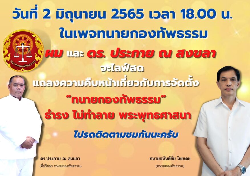 ต่อมาเมื่อวันที่ 28 พ.ค. ผู้สื่อข่าวรายงานว่า เพจเฟซบุ๊ก ทนาย อนันต์ชัย ไชยเดช และเพจเฟซบุ๊ก กองธรรมทัพ ได้รายงานความเคลื่อนไหวการจัดตั้งทนายกองทัพธรรม โดยทนายอนันตชัยระบุว่า วันที่ 2 มิถุนายน 2565 เวลา 18.00 น. ในเพจ #ทนายกองทัพธรรม ผม และ ดร. ประกาย ณ สงขลา หรือ อาจารย์ดอน จะไลฟ์สด แถลงความคืบหน้าเกี่ยวกับการจัดตั้ง “#ทนายกองทัพธรรม” ซึ่งขณะนี้มีผู้ลงทะเบียนรวม 373 คน เป็นผู้มีความรู้ทางศาสนา 188 คน เป็นทนายความ 185 คน ทนายความที่ส่งใบอนุญาตทนายความ 70 คน อีก 115 คน ยังไม่ได้ส่งใบอนุญาตทนายความครับ