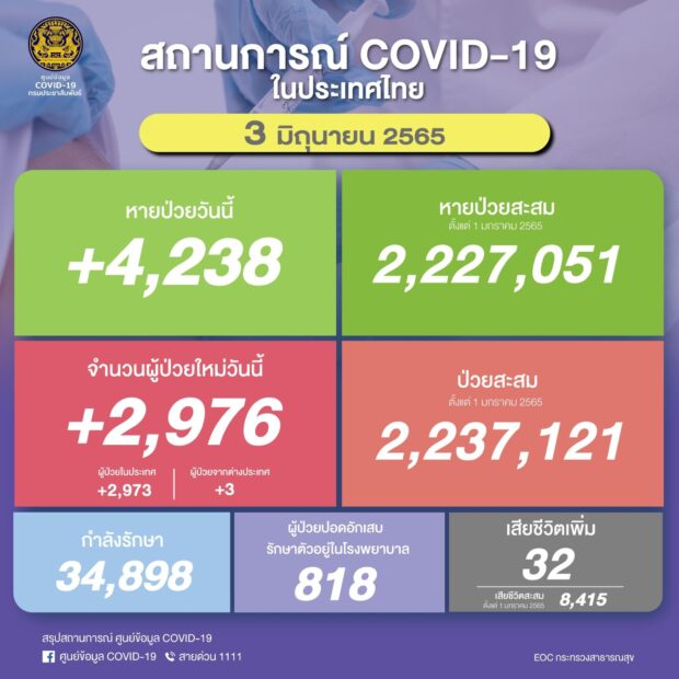 สถานการณ์แพร่ระบาดของโรคโควิด-19 ประจำวัน ศูนย์บริหารสถานการณ์การแพร่ระบาดของโรคติดเชื้อไวรัสโคโรนา 2019 (ศบค.) รายงานสถานการณ์การระบาดของไวรัสโคโรนา 2019 ล่าสุด วันที่ 3 มิ.ย. 65 มีจำนวนผู้ป่วยใหม่ 2,976 ราย ผู้ป่วยสะสม (ตั้งแต่ 1 มกราคม 2565) 2,237,121 ราย หายป่วยกลับบ้าน 4,238 ราย หายป่วยสะสม (ตั้งแต่ 1 มกราคม 2565) 2,227,051 ราย กำลังรักษา 34,898 ราย เสียชีวิต 342ราย เสียชีวิตสะสม (ตั้งแต่ 1 มกราคม2565) 8,415ราย จำนวนผู้ป่วยปอดอักเสบรักษาตัวอยู่ในโรงพยาบาล 818 ราย