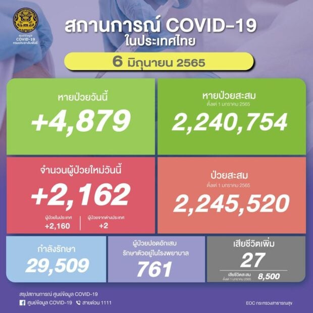 สถานการณ์แพร่ระบาดของโรคโควิด-19 ประจำวัน ศูนย์บริหารสถานการณ์การแพร่ระบาดของโรคติดเชื้อไวรัสโคโรนา 2019 (ศบค.) รายงานสถานการณ์การระบาดของไวรัสโคโรนา 2019 ล่าสุด วันที่ 6 มิ.ย. 65 มีจำนวนผู้ป่วยใหม่ 2,162 ราย เป็นผู้ป่วยในประเทศ 2,160 ราย ผู้ป่วยจากต่างประเทศ 2 ราย ผู้ป่วยสะสม (ตั้งแต่ 1 มกราคม 2565) 2,245,520 ราย หายป่วยกลับบ้าน 4,879 ราย หายป่วยสะสม (ตั้งแต่ 1 มกราคม 2565) 2,240,754 ราย กำลังรักษา 29,509 ราย เสียชีวิต 27 ราย เสียชีวิตสะสม (ตั้งแต่ 1 มกราคม 2565) 8,500 ราย จำนวนผู้ป่วยปอดอักเสบรักษาตัวอยู่ในโรงพยาบาล 761 ราย