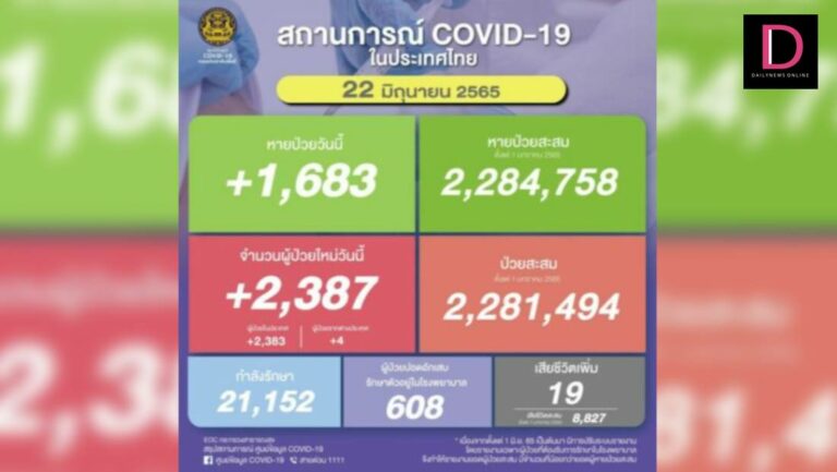 สถานการณ์แพร่ระบาดของโรคโควิด-19 ประจำวัน ศูนย์บริหารสถานการณ์การแพร่ระบาดของโรคติดเชื้อไวรัสโคโรนา 2019 (ศบค.) รายงานสถานการณ์การระบาดของไวรัสโคโรนา 2019 ล่าสุด วันที่ 22 มิ.ย. 65 มีจำนวนผู้ป่วยใหม่ 2,387 ราย เป็นผู้ป่วยในประเทศ 2,383 ราย ผู้ป่วยจากต่างประเทศ 4 ราย ผู้ป่วยสะสม (ตั้งแต่ 1 มกราคม 2565) 2,281,494 ราย หายป่วยกลับบ้าน 1,683 ราย หายป่วยสะสม (ตั้งแต่ 1 มกราคม 2565) 2,284,758 ราย กำลังรักษา 21,152 ราย เสียชีวิต 19 ราย เสียชีวิตสะสม (ตั้งแต่ 1 มกราคม 2565) 8,827 ราย จำนวนผู้ป่วยปอดอักเสบรักษาตัวอยู่ในโรงพยาบาล 608 ราย