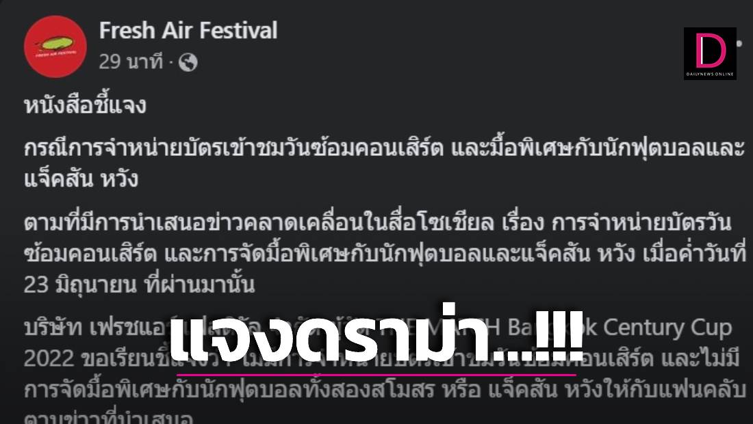 ล่าสุด เพจ “Fresh Air Festival” ซึ่งเป็นผู้จัดงาน ได้ออกมาชี้แจงโดนระบุว่า “กรณีการจำหน่ายบัตรเข้าชมวันซ้อมคอนเสิร์ต และมื้อพิเศษกับนักฟุตบอลและแจ็คสัน หวัง ตามที่มีการนำเสนอข่าวคลาดเคลื่อนในสื่อโซเชียล เรื่อง การจำหน่ายบัตรวันซ้อมคอนเสิร์ต และการจัดมื้อพิเศษกับนักฟุตบอลและแจ็คสัน หวัง เมื่อค่ำวันที่ 23 มิถุนายน ที่ผ่านมานั้น”