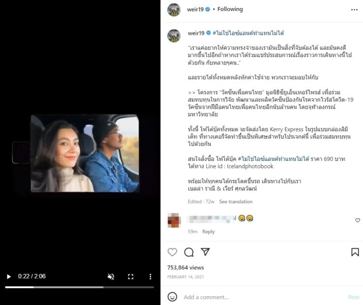 อย่างไรก็ตาม ก่อนหน้านี้หลังจากหนุ่มเวียร์แจ้งข่าวเรื่องการแต่งงานสายฟ้าแลบ ชาวเน็ตก็ได้เข้าไปส่องที่อินสตาแกรมของหนุ่มเวียร์ ก็พบว่าไม่เห็นภาพคู่ของ เวียร์ และ “เบลล่า” อดีตแฟนสาวแล้ว คาดว่าถูกลบออกไปแล้วจากอินสตาแกรม แต่ทั้งนี้ก็ยังเหลืออยู่ 1 คลิป ซึ่งเป็นวิดีโอที่ถ่ายคู่กับสาวเบลล่าตอนไปเที่ยวต่างประเทศด้วยกัน โดยหนุ่มเวียร์ โพสต์ไว้เมื่อวันที่ 14 กุมภาพันธ์ ปีที่แล้ว