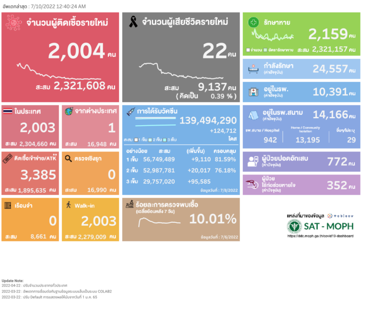 สถานการณ์แพร่ระบาดของโรคโควิด-19 ประจำวัน ศูนย์บริหารสถานการณ์การแพร่ระบาดของโรคติดเชื้อไวรัสโคโรนา 2019 (ศบค.) รายงานสถานการณ์การระบาดของไวรัสโคโรนา 2019 ล่าสุด วันที่ 10 ก.ค. 65 มีจำนวนผู้ป่วยใหม่ 2,004 ราย เป็นผู้ป่วยในประเทศ 2,003 ราย ผู้ป่วยจากต่างประเทศ 1 ราย ผู้ป่วยสะสม (ตั้งแต่ 1 มกราคม 2565) 2,321,608 ราย หายป่วยกลับบ้าน 2,159 ราย หายป่วยสะสม (ตั้งแต่ 1 มกราคม 2565) 2,321,157 ราย กำลังรักษา 24,557 ราย เสียชีวิต 22 ราย เสียชีวิตสะสม (ตั้งแต่ 1 มกราคม 2565) 9,137 ราย จำนวนผู้ป่วยปอดอักเสบรักษาตัวอยู่ในโรงพยาบาล 772 ราย ขณะที่มีผู้ติดเชื้อเข้าข่าย ATK จำนวน 3,385 ราย