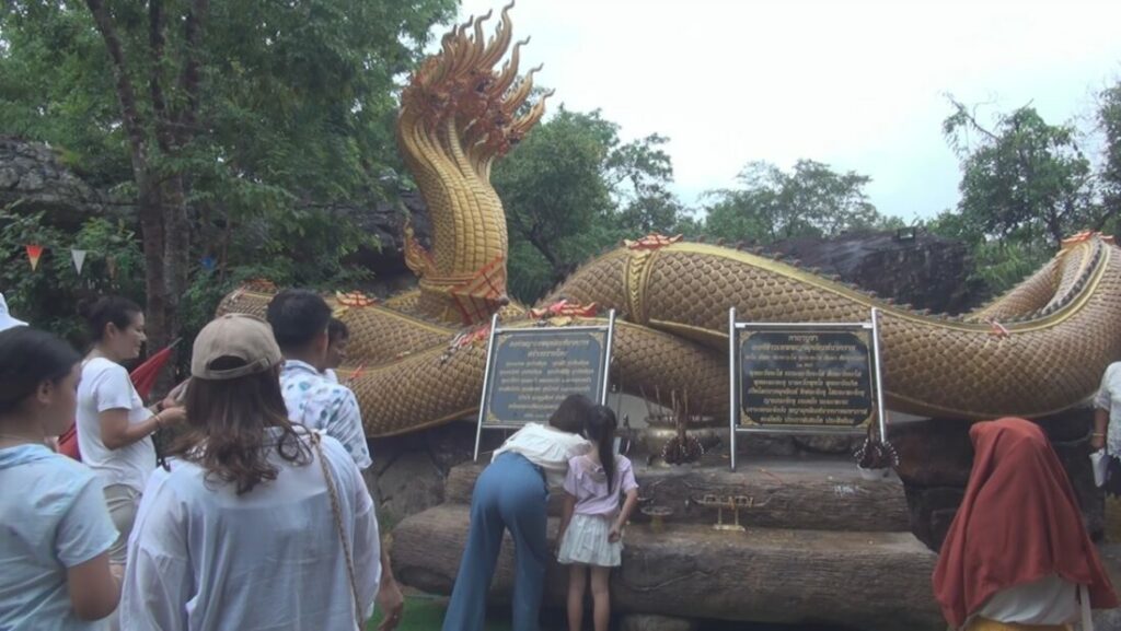 เมื่อวันที่ 10 ก.ค. ผู้สื่อข่าวรายงานว่า ที่วัดภูตะเภาทอง ต.กุดหมากไฟ อ.หนองวัวซอ จ.อุดรธานี ตรงกับวันหยุดมีนักท่องเที่ยวทั้งสายบุญ สายพญานาค โดยเฉพาะบรรดาคอหวย แห่มากราบขอพร ขอโชคลาภ ความเจริญรุ่งเรื่องในหน้าที่การงาน กับ เจ้าปู่หินหยก เจ้าปู่มุจลินท์นาคราช และ ตอตะเคียนพันปีสองพี่น้อง “เจ้าแม่ทอง-ทิพย์” ที่เคยให้โชคลาภสมหวังกับผู้เดินทางมาด้วยความเชื่อ และความศรัทธา มาแล้วมากมาย