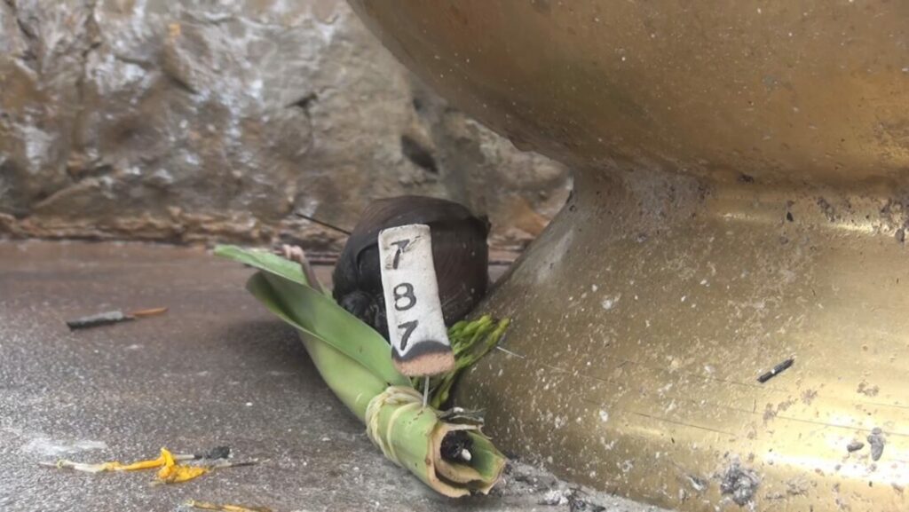 โดยวันนี้ นายประวิทย์ นาทองบ่อ อายุ 40 ปี พร้อมครอบครัวและเพื่อนๆ ชาว อ.หัวหิน จ.ประจวบคีรีขันธ์ หลังเดินชมความงามรอบบริเวณวัดภูตะเภาทอง และกราบสักการะองค์หลวงปู่หินหยกแล้วได้พากันมาพนมมือตั้งจิตอธิฐานขอพร และจุดธูปมงคลเสี่ยงทายขอโชคลาภ ของเลขเด็ดที่วังบาดาล หรือประตูสู่ขุมทรัพย์ เจ้าปู่มุจลินท์นาคราช 7 เศียรองค์สีทองเหลืองอร่าม ที่ประดิษฐานอยู่เหนือวังบาลดาล โดยนายประวิทย์ เป็นคนนำกล่าวคำอธิฐาน และจุดธูปมงคลเสี่ยงทาย ปรากฏเลข 787 ทำเอาคอหวยและนักท่องเที่ยวไม่รอช้าหยิบโทรศัพท์ขึ้นมาถ่ายภาพเก็บไว้นำไปเสี่ยงโชคและส่งต่อไปให้ญาติมิตรสหาย จากนั้นพากันเดินไปสักการะขอโชคลาภเลขเด็ดจุดที่ 2 บริเวณหน้าตอตะเคียนพันปีสองพี่น้อง เจ้าแม่ตะเคียนทอง-ทิพย์ ปรากฏตัวเลข 936 ทำให้นายประวิทย์ คนจุดธูปมงคล ถึงกับขนลุกเนื่องจากเลขธูปมงคลตรงกับเลขทะเบียนรถตู้ที่ขับมาจาก อ.หัวหิน คือเลข 9036 จึงนำไปหาซื้อเลขเด็ดเสี่ยงโชค