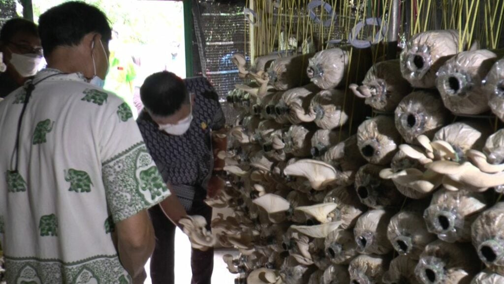 จากนั้น ผวจ.สมุทรสงคราม ได้ทดลองทำก้อนเชื้อเห็ดในถุงพลาสติก มัดจุกก้อนเห็ดและอุดสำลีเพื่อนำไปฆ่าเชื้อในตู้อบพลังงานแสงอาทิตย์ ก่อนเก็บเห็ดเป๋าฮื้อในโรงเรือน และชิมมัชรูมคอฟฟี่หรือกาแฟผสมน้ำเห็ด 8 ชนิด รวมทั้งเห็ดภูฏานกรอบที่รสชาติอร่อยและดีต่อสุขภาพอีกด้วย
