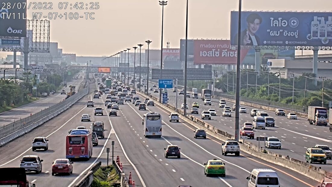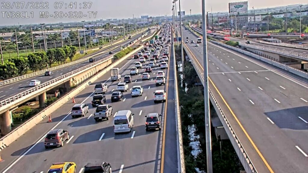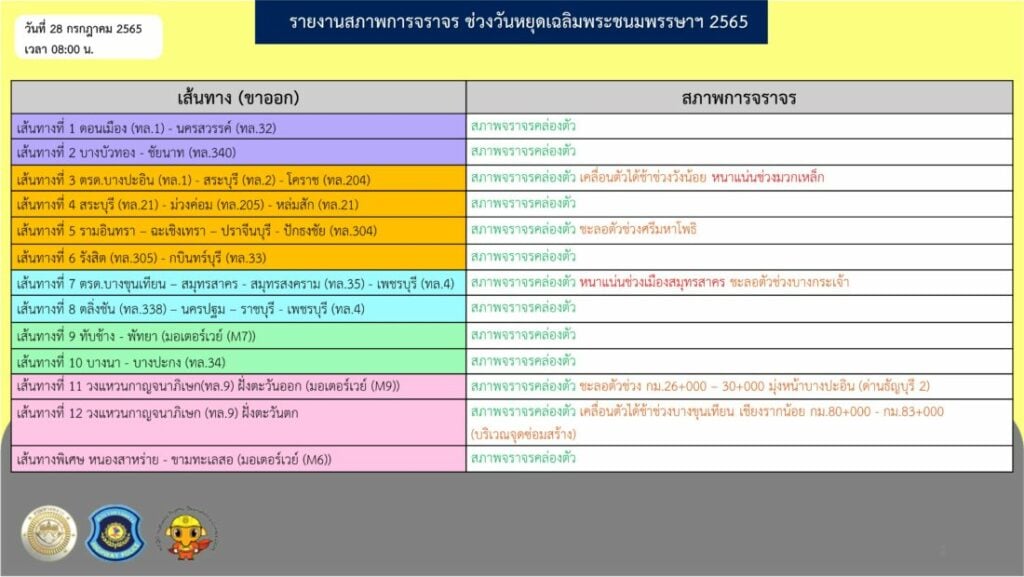 รายงานข่าวจากกรมทางหลวง (ทล.) แจ้งว่า เมื่อเวลา 08.00 น. วันนี้ (28 ก.ค.65) สำนักอำนวยความปลอดภัย และศูนย์บริหารจัดการจราจรและอุบัติเหตุ (HTOC) ได้รายงานสภาพจราจรประชาชนเดินทางช่วงวันหยุดยาว วันเฉลิมพระชนมพรรษาพระบาทสมเด็จพระเจ้าอยู่หัว ระหว่างวันที่ 28-31 ก.ค.65 บนถนนสายหลัก และ ทางหลวงพิเศษระหว่างเมือง (มอเตอร์เวย์) จำนวน 12 เส้นทางหลัก ซึ่งเป็นวันหยุดยาววันแรก พบว่า ในภาพรวมปริมาณการจราจรคล่องตัว แต่มีหนาแน่น ชะลอตัว และเคลื่อนตัวได้ช้าได้บางเส้นทาง