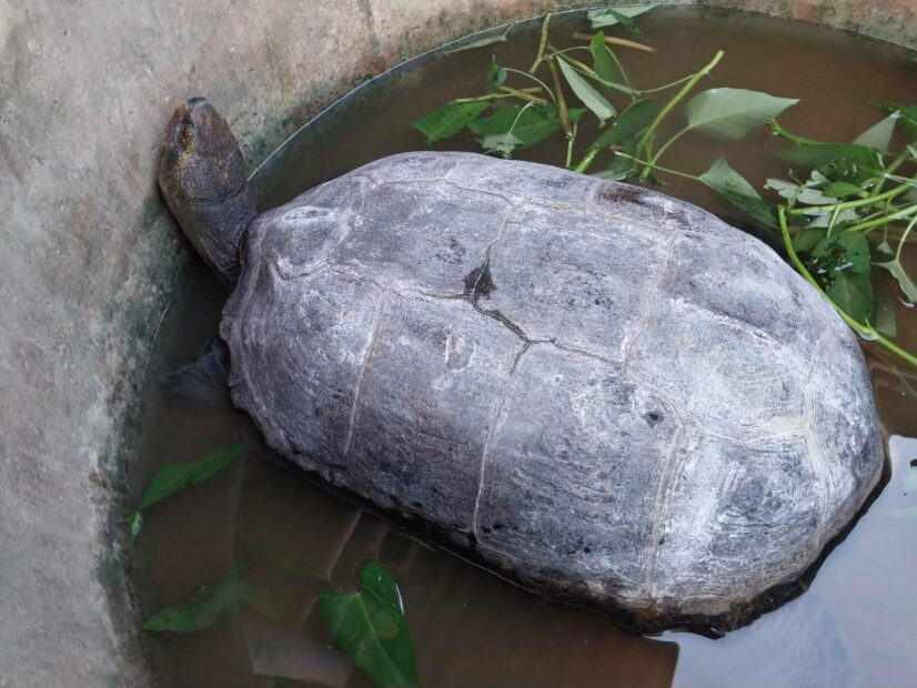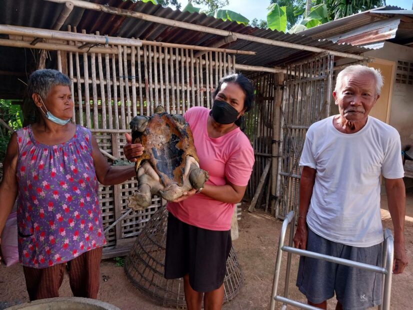 เมื่อวันที่ 28 ก.ค. ผู้สื่อข่าวได้รับแจ้งจากชาวบ้านว่า ได้มีตายายสองคนได้พบเต่ายักษ์คลานเข้ามาหลังบ้าน จึงได้เดินทางเข้าไปตรวจสอบที่บ้านเลขที่ 8 บ้านกระชาย หมู่ที่ 14 ต.ยาง อ.ศีขรภูมิ จ.สุรินทร์ พบคุณตาเมือง ทองย้อย อายุ 77 ปี และคุณยายสำเภา ทองย้อยอายุ 70 ปี สองสามีภรรยา พาเข้าไปดูภายในสวน ซึ่งมีพื้นที่ประมาณ 1 ไร่เศษ พบเต่าขนาดใหญ่ถูกขังไว้ ให้กินผักบุ้งอยู่ภายในท่อซีเมนต์