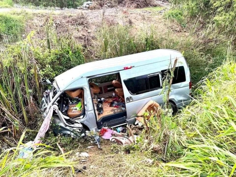 ไปไม่ถึงวัด! รถตู้มรณะเสียหลักพลิกควํ่า นักแสวงบุญหญิงดับสยอง 8 ศพ