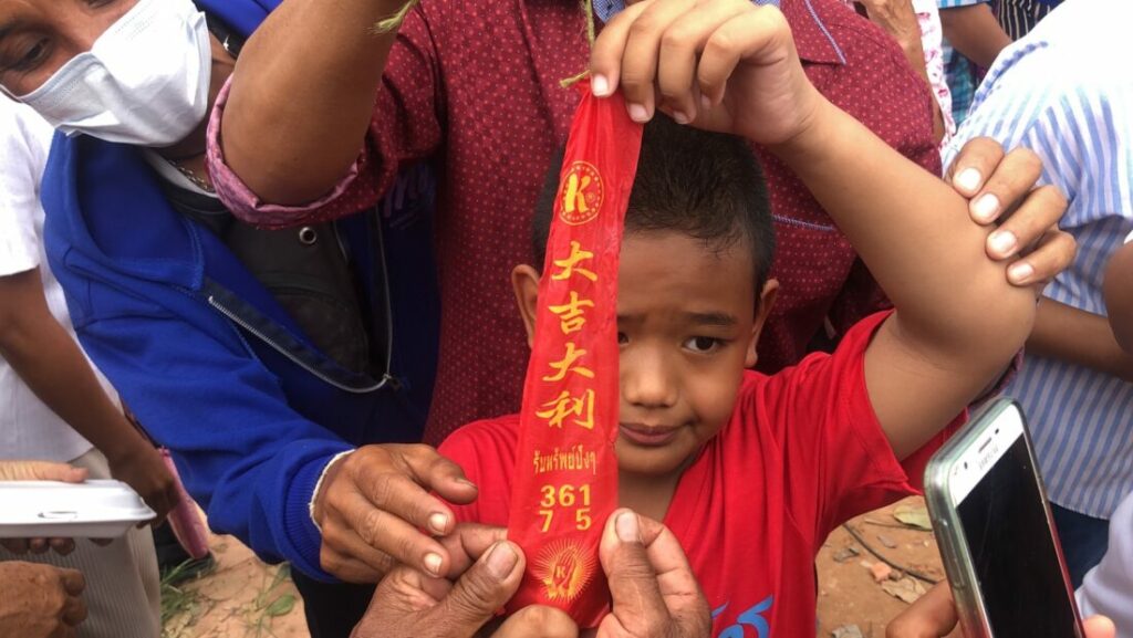 โดยหลังการทำพิธีนั้น มีการจุดประทัดจำนวน 4,000 นัด และพอเสียงประทัดดังสงบลง สิ่งที่ทุกคนอยากเห็นและเฝ้าดูกัน คือตัวเลขจากหางประทัด เขียนไว้ที่ผ้าแดง ตัวเลขสีเหลือง คือที่ปราฏฎตือตัวเลข 361 และ 75 ซึ่งผู้ที่มาร่วมพิธีต่างมุงดูและจดจำไว้เพื่อนำไปใช้เป็นแนวทางในการหาซื้อสลากกินแบ่งรัฐบาลตามความเชื่อต่อไป.