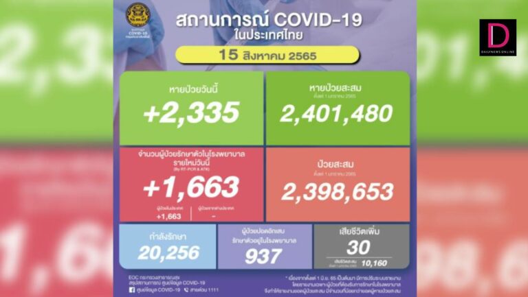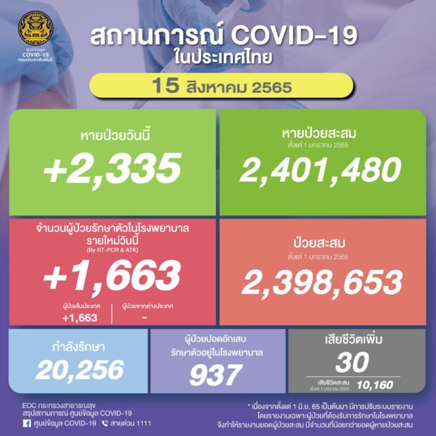 สถานการณ์แพร่ระบาดของโรคโควิด-19 ประจำวัน ศูนย์บริหารสถานการณ์การแพร่ระบาดของโรคติดเชื้อไวรัสโคโรนา 2019 (ศบค.) รายงานสถานการณ์การระบาดของไวรัสโคโรนา 2019 ล่าสุด วันที่ 15 สิงหาคม 2565 มีจำนวนผู้ป่วยรักษาตัวในโรงพยาบาลรายใหม่วันนี้ 1,663 ราย เป็นผู้ป่วยในประเทศ 1,663 ราย ผู้ป่วยจากต่างประเทศ 0 ราย ผู้ป่วยสะสม (ตั้งแต่ 1 มกราคม 2565) 2,398,653 ราย หายป่วยกลับบ้าน 2,335 ราย หายป่วยสะสม (ตั้งแต่ 1 มกราคม 2565) 2,401,480 ราย กำลังรักษา 20,256 ราย เสียชีวิต 30 ราย เสียชีวิตสะสม (ตั้งแต่ 1 มกราคม 2565) 10,160 ราย จำนวนผู้ป่วยปอดอักเสบรักษาตัวอยู่ในโรงพยาบาล 937 ราย