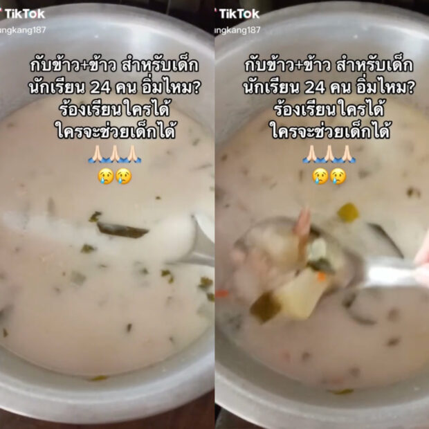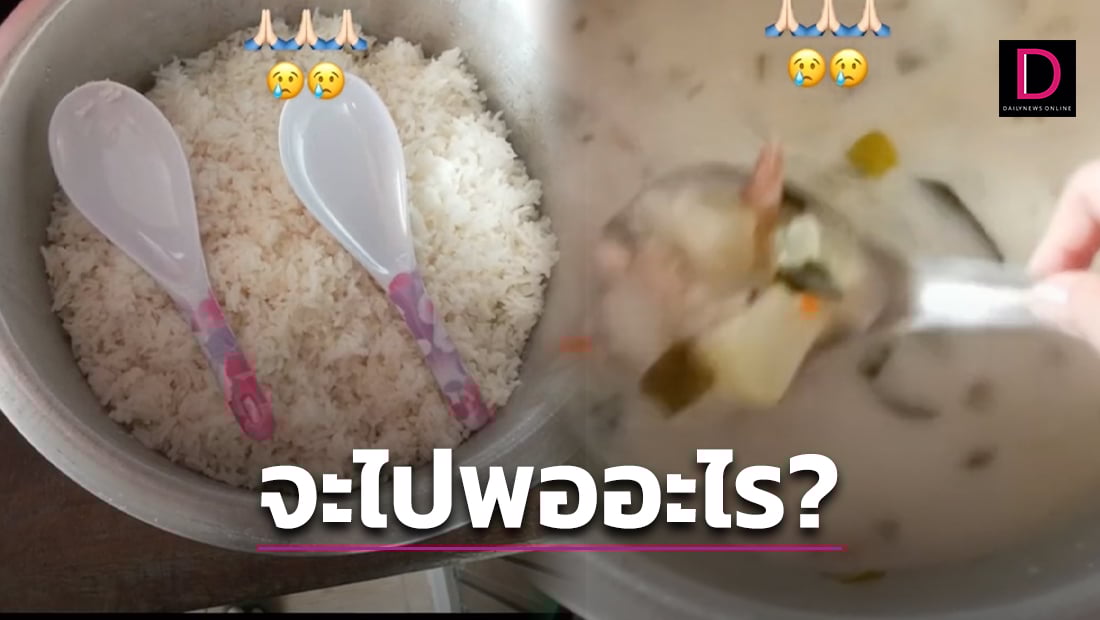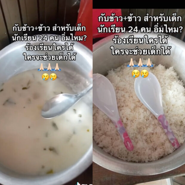 ข้อความในคลิประบุว่า ‘กับข้าว+ข้าว สำหรับเด็ก 24 คน อิ่มไหม? ร้องเรียนใครได้ ใครจะช่วยเด็กได้’ พร้อมกับแคปชั่น ‘กับข้าวและข้าว สำหรับเด็ก 24 คน มันเพียงพอหรือ ผู้ใหญ่บ้านเมืองช่วยเด็กๆ ที’