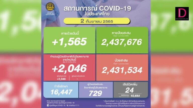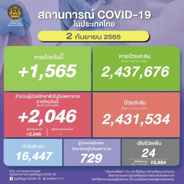 สถานการณ์แพร่ระบาดของโรคโควิด-19 ประจำวัน ศูนย์บริหารสถานการณ์การแพร่ระบาดของโรคติดเชื้อไวรัสโคโรนา 2019 (ศบค.) รายงานสถานการณ์การระบาดของไวรัสโคโรนา 2019 ล่าสุด วันที่ 2 กันยายน 2565 มีจำนวนผู้ป่วยรักษาตัวในโรงพยาบาลรายใหม่วันนี้ 2,046 ราย เป็นผู้ป่วยในประเทศ 2,046 ราย ผู้ป่วยจากต่างประเทศ 0 ราย ผู้ป่วยสะสม (ตั้งแต่ 1 มกราคม 2565) 2,431,534 ราย หายป่วยกลับบ้าน 1,565 ราย หายป่วยสะสม (ตั้งแต่ 1 มกราคม 2565) 2,437,676 ราย กำลังรักษา 16,447 ราย เสียชีวิต 24 ราย เสียชีวิตสะสม (ตั้งแต่ 1 มกราคม 2565) 10,654 ราย จำนวนผู้ป่วยปอดอักเสบรักษาตัวอยู่ในโรงพยาบาล 729 ราย