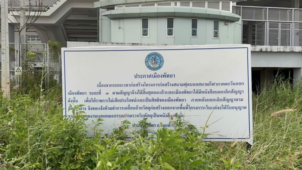นอกจากนี้ยังพบป้าย “ประกาศเมืองพัทยา” ขนาดใหญ่มาปักติดไว้ระบุว่า เนื่องจากระยะเวลาก่อสร้างโครงการสนามฟุตบอล สนามกีฬาภาคตะวันออกเมืองพัทยา ระยะที่ 3 ตามสัญญาได้สิ้นสุดลงแล้วและเมืองพัทยาได้มีหนังสือยกเลิกสัญญา ดังนั้นเพื่อให้ราชการไม่เสียประโยชน์และเป็นสิทธิของเมืองพัทยา ภายหลังบอกเลิกสัญญาตามสัญญาจ้าง จึงขอแจ้งห้ามทำการเคลื่อนย้ายวัสดุก่อสร้างออกจากพื้นที่โครงการเว้นแต่จะได้รับอนุญาตจากผู้ควบคุมงานและคณะกรรมการตรวจรับเป็นหนังสือเท่านั้น ประกาศให้ทราบโดยทั่วกัน