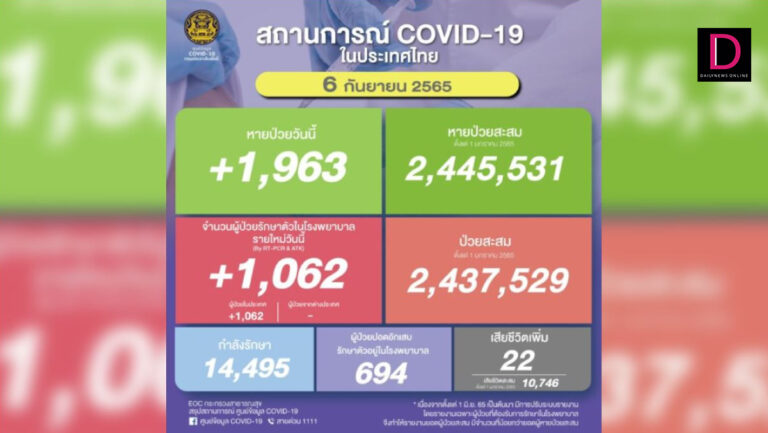 สถานการณ์แพร่ระบาดของโรคโควิด-19 ประจำวัน ศูนย์บริหารสถานการณ์การแพร่ระบาดของโรคติดเชื้อไวรัสโคโรนา 2019 (ศบค.) รายงานสถานการณ์การระบาดของไวรัสโคโรนา 2019 ล่าสุด วันที่ 6 กันยายน 2565 มีจำนวนผู้ป่วยรักษาตัวในโรงพยาบาลรายใหม่วันนี้ 1,062 ราย เป็นผู้ป่วยในประเทศ 1,062 ราย ผู้ป่วยจากต่างประเทศ 0 ราย ผู้ป่วยสะสม (ตั้งแต่ 1 มกราคม 2565) 2,437,529 ราย หายป่วยกลับบ้าน 1,963 ราย หายป่วยสะสม (ตั้งแต่ 1 มกราคม 2565) 2,445,531 ราย กำลังรักษา 14,495 ราย เสียชีวิต 22 ราย เสียชีวิตสะสม (ตั้งแต่ 1 มกราคม 2565) 10,746 ราย จำนวนผู้ป่วยปอดอักเสบรักษาตัวอยู่ในโรงพยาบาล 694 ราย