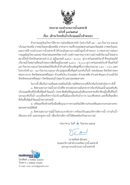 ผู้สื่อข่าวรายงานว่า กองอำนวยการน้ำแห่งชาติ ออกประกาศ ฉบับที่ 38/2565 เรื่อง เฝ้าระวังระดับน้ำบริเวณแม่น้ำเจ้าพระยา ด้วยกรมอุตุนิยมวิทยาได้คาดการณ์จะมีฝนตกหนัก ในช่วงวันที่ 12-17 กันยายน 2565 บริเวณภาคเหนือ ภาคตะวันออกเฉียงเหนือ ภาคกลาง รวมทั้งกรุงเทพมหานครและปริมณฑล ภาคตะวันออก และภาคใต้ กองอำนวยการน้ำแห่งชาติ ได้ประเมินสถานการณ์น้ำลุ่มน้ำเจ้าพระยา