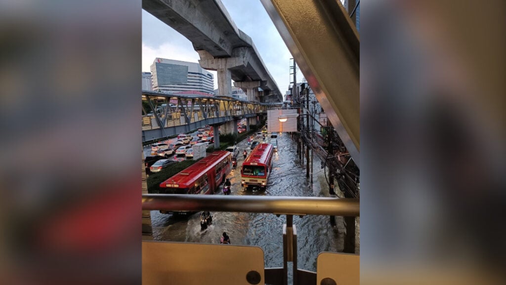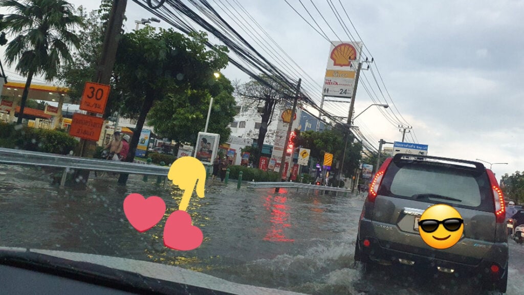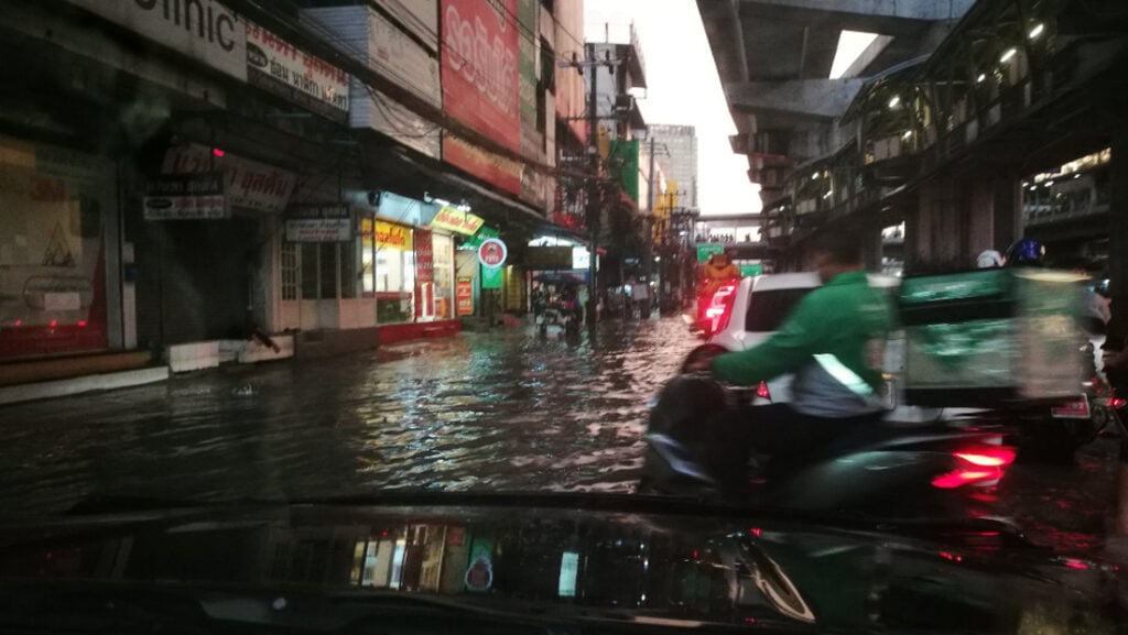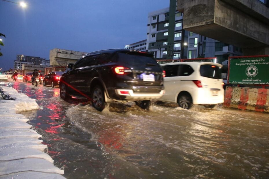 เมื่อวันที่ 12 ก.ย. ผู้สื่อข่าวรายงานว่าได้มีฝนตกลงมาอย่างหนักในหลายพื้นที่ของกรุงเทพมหานครและปริมณฑล ส่งผลให้น้ำเกิดท่วมขังรอการะบายหลายจุด โดยเฉพาะในพื้นที่ลุ่มต่ำเป็นแอ่งกระทะ จะมีน้ำท่วมสูงกว่าพื้นที่อื่น ๆ ทั้งนี้ทางทวิตเตอร์ของ จส.100 และสวพ. 91 ได้มีคนเข้าไปโพสต์ภาพเอาไว้มากมาย เพื่อแจ้งเตือนให้หลีกเลี่ยงเส้นทางดังกล่าว หรือ เดินทางด้วยความระมัดระวังโดยเฉพาะรถคันเล็ก ต้องระวังเป็นพิเศษ เพราะอาจเจอน้ำซัดเข้าเครื่อง ทำให้เครื่องดับระหว่างเดินทางได้.