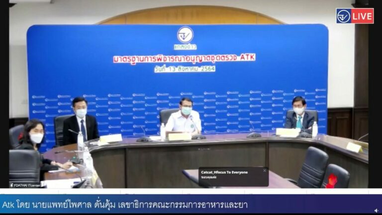 เมื่อวันที่ 13 ส.ค. ที่สำนักงานคณะกรรมการอาหารและยา นพ.ไพศาล ดั่นคุ้ม เลขาธิการคณะกรรมการอาหารและยา (อย.) พร้อมด้วย นพ.สุรโชค ต่างวิวัฒน์ รองเลขาธิการ อย. และนพ.วิฑูรย์ ด่านวิบูลย์ ผอ.องค์การเภสัชกรรม นางศิรินุช ชีวันพิศาลนุกูล รอง ผอ.องค์การเภสัชกรรม ร่วมกันแถลงข่าวมาตรฐานการพิจารณาอนุญาตชุดตรวจแอนติเจน เทสต์ คิต (ATK) ของ Beijing Lepu Medical Technology Co., Ltd. จาก สาธารณรัฐประชาชนจีน นำเข้าโดยบริษัท ออสแลนด์ แคปปิตอล จำกัด