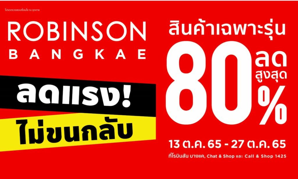 @ โรบินสัน จัดโปรโมชั่นพิเศษในแคมเปญ “โรบินสันบางแค ลดแรง! ไม่ขนกลับ” ลดสูงสุด 80% ! ระหว่างวันที่ 13 ต.ค.65 – 27 พ.ย.65 เพื่อตอบแทนลูกค้าที่สนับสนุนช้อปปิ้ง ที่โรบินสันสาขาบางแค มาโดยตลอด กับโปรโมชั่นดังนี้ สินค้าแบรนด์ดัง ทุกชั้น ทุกแผนก ลดสูดสุด 80% พิเศษ เฉพาะสมาชิก The1 (เดอะวัน) รับฟรีคูปองส่วนลด พร้อมสิทธิพิเศษเพิ่มเติมจากบัตรเครดิตที่ร่วมรายการ และสามารถชอปปิงกับแคมเปญอื่นๆ อีกมากมาย ที่ห้างโรบินสัน หรือช้อปผ่านเฟซบุ๊กเพจ https://www.facebook.com/RobinsonDepartmentStore