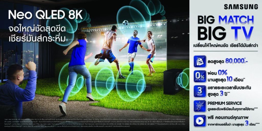 @ ซัมซุง พร้อมจัดหนักจัดเต็มเอาใจแฟนคอบอลชาวไทยที่รอคอยรับชมและเชียร์เทศกาลฟุตบอลระดับโลกด้วยโปรโมชั่นเด็ด “BIG MATCH BIG TV” เปลี่ยนให้ใหญ่คมชัด เชียร์ได้มันส์กว่ากับ “Neo QLED 8K” รับชมเทคโนโลยี 8K ที่ดีที่สุด ตั้งแต่วันนี้-31 ธันวาคม 2565 ลดสูงสุด 80,000 บาท, ผ่อนนานสูงสุด 10 เดือน, ขยายระยะเวลารับประกัน 3 ปี พร้อมรับชมฟรี คอนเทนต์คุณภาพ จากพาร์ทเนอร์ชั้นนำ นานสูงสุด 3 เดือน AIS Play, Mono Max และ Apple TV ดูรายละเอียดที่ https://www.samsung.com/th/