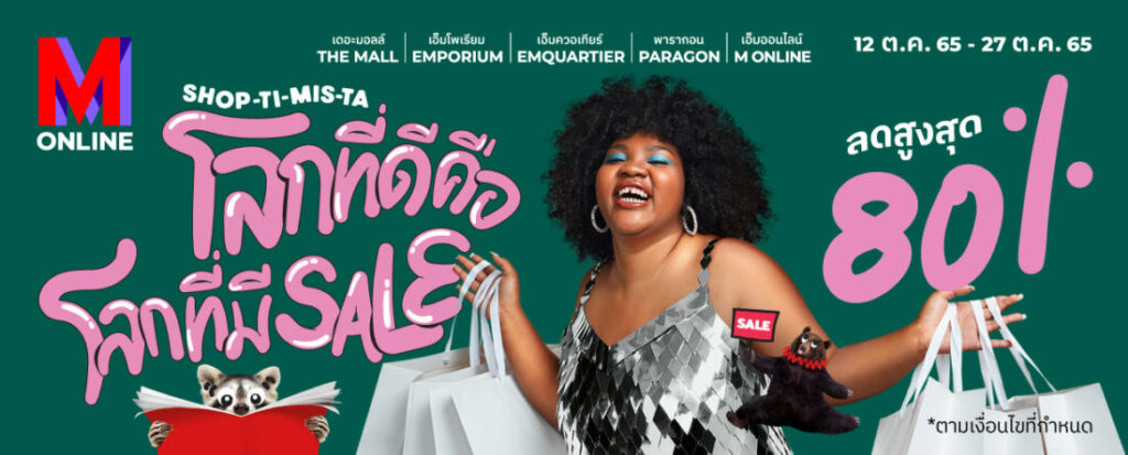 @ เดอะมอลล์ จัดแคมเปญ “M Online Shop Ti Mis Ta” โลกสวยด้วยเรื่อง SALES ขนทัพสินค้าแบรนด์ดังทุกชิ้น ทั้งเว็บ ลดแรงสูงสุด 80% กรอกโค้ดลดเพิ่มสูงสุด 3,000 บาท ลูกค้าบัตรเครดิต SCB M VISA ลดเพิ่มสูงสุด 5,000 บาท M CARD ใช้คะแนน 600 คะแนน รับส่วนลดเพิ่ม 100 บาท หรือแบ่งชำระเบาๆ 0% นานสูงสุด 12 เดือน พิเศษ!! บริการส่งด่วน ภายใน 3 ชั่วโมง พร้อมบริการห่อของขวัญและจัดส่งฟรีทั่วไทยทุกคำสั่งซื้อไม่มีขั้นต่ำ ตั้งแต่วันที่ 12 – 27 ตุลาคม 2565 เพียงคลิกซื้อผ่าน M ONLINE APP ตลอด 24 ชั่วโมง