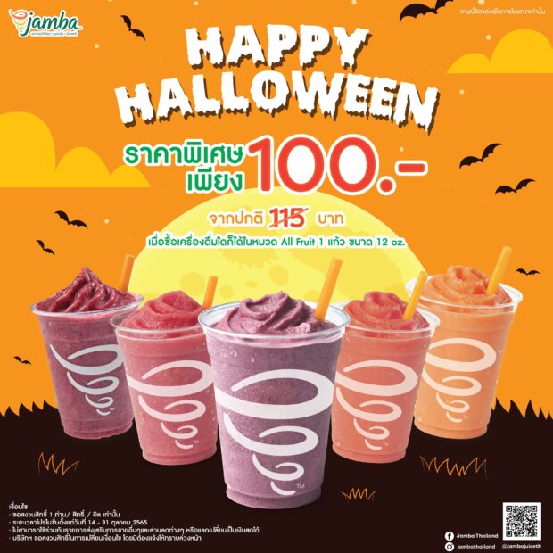 @ ฉลองเทศกาลหลอนแห่งปี Happy Halloween กับโปรโมชั่นสุดพิเศษจาก Jamba ที่พร้อมจะปลุกวิญญาณความสดชื่นด้วย เครื่องดื่มหมวด All Fruit เครื่องดื่มน้ำผลไม้ธรรมชาติแท้ 100% ไม่ว่าจะเป็น Strawberry Dream, Banana Berry, Mango A Go Go, Razzmatazz, Caribbean Passion และ Tropical Passion ขนาด 12 oz ในราคาเพียง 100 บาท (จากปกติ 115 บาท) ตั้งแต่วันนี้-31 ตุลาคม 2565 ติดตามความเคลื่อนไหวของแจมบาร์ ได้ที่ www.facebook.com/jambajuicethailand